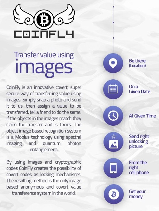 CoinFly is an innovative, covert, super secure way of transferring value using images. Simply snap a photo and send it to us, then assign a value to be transferred, tell a friend to do the same. If the objects in the images match they claim the transfer and is theirs. The computer vision based recognition system is a Mobius technology using spectral imaging and Convolutional Neural Networks.
